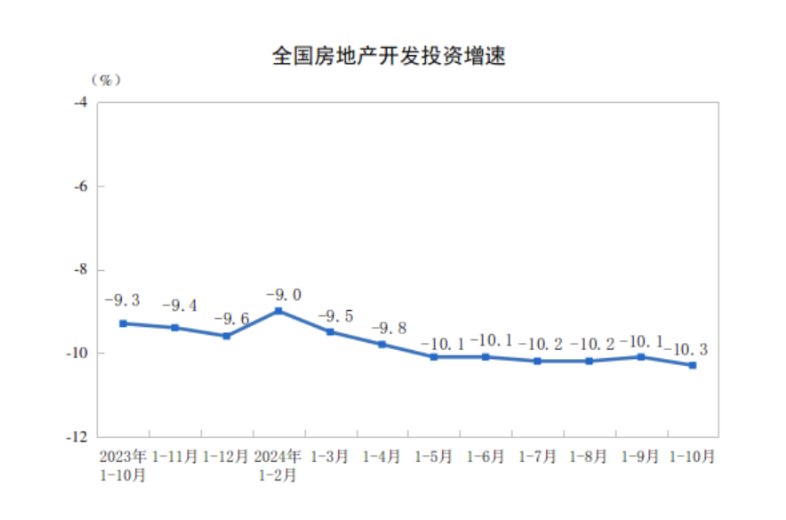 1—10月份,全国房地产开发投资86309亿元,同比下降10.3%(按可比口径计算);其中,住宅投资65644亿元,下降10.4%。