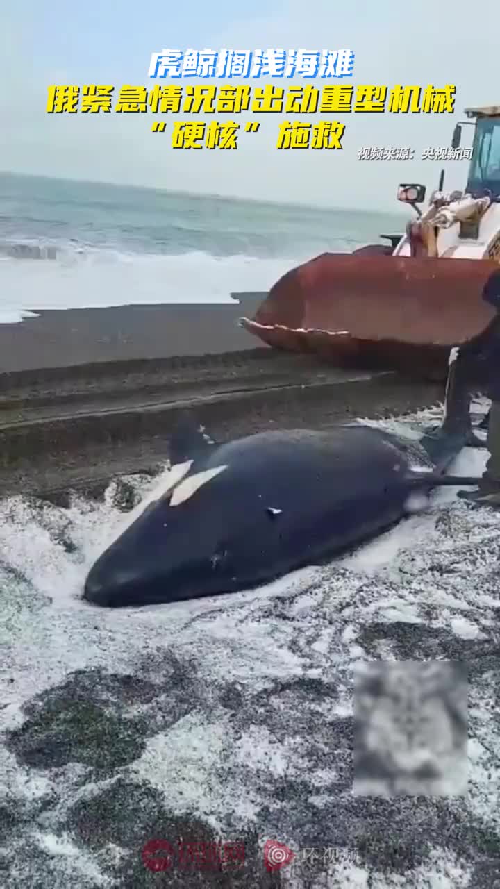 虎鲸搁浅海滩,俄紧急情况部出动重型机械“硬核”施救。