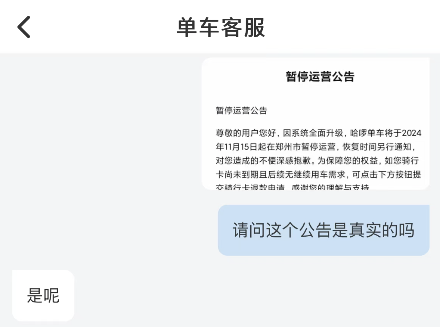 美团、哈啰单车今日起在郑州市暂停运营,客服确认属实。