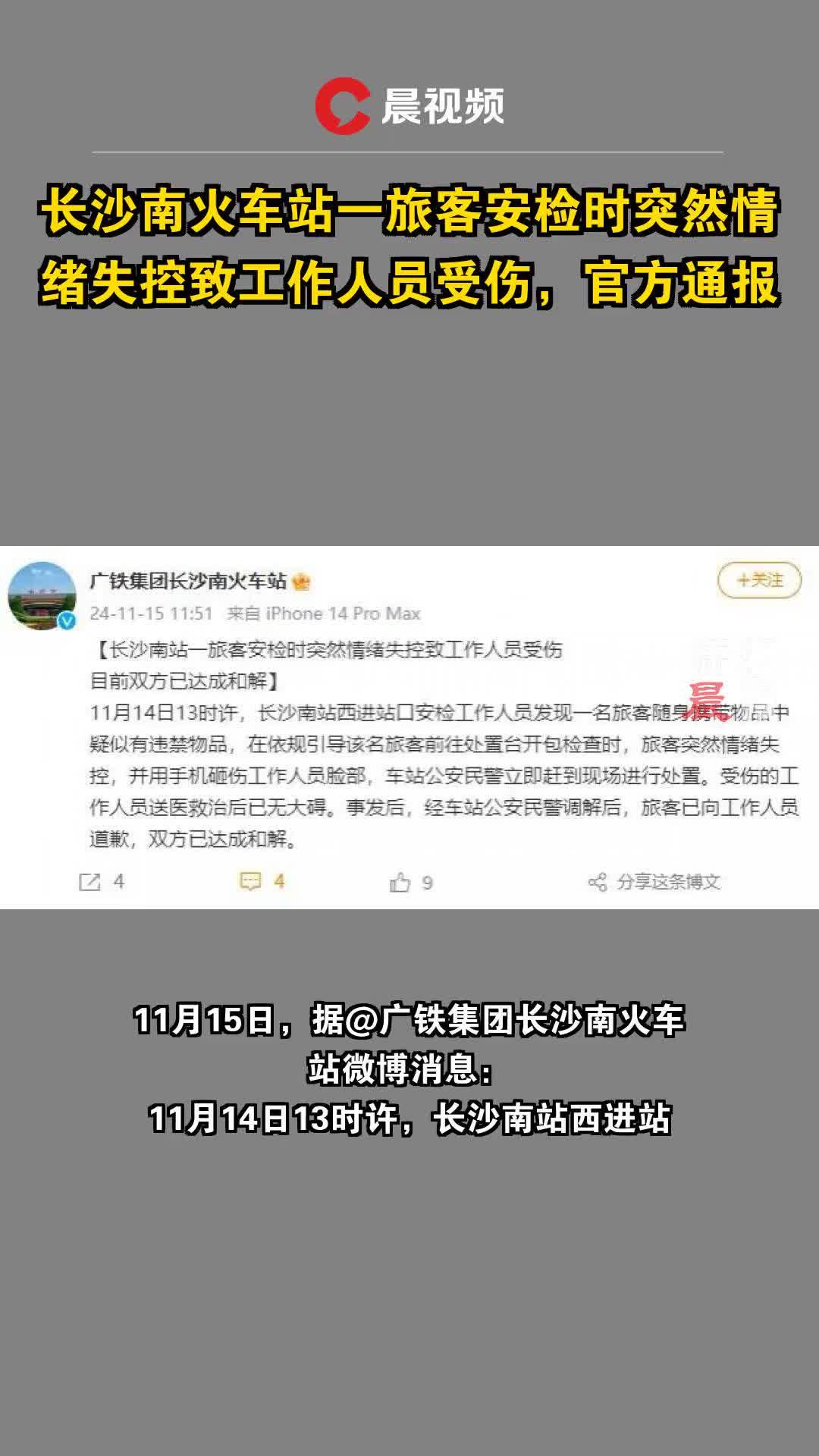 广铁集团发布通告称,受伤工作人员已送医救治,目前无大碍。经车站公安民警调解,旅客已向工作人员道歉,双方已达成和解。(via 潇湘晨报)