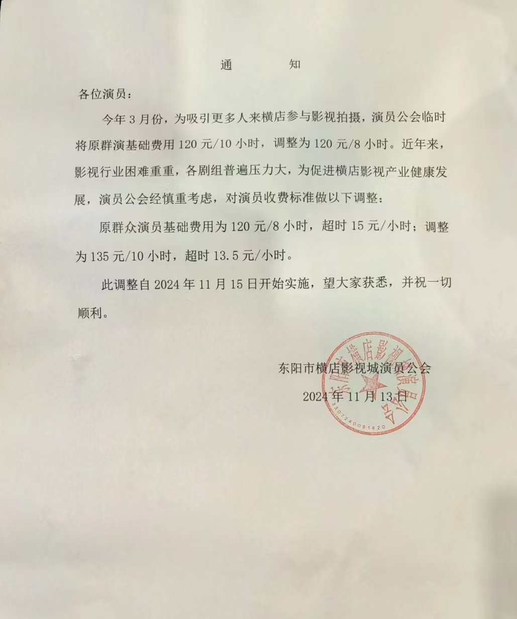 邹军(化名)在今年夏天去横店专职做群演,他告诉红星资本局,他在昨天接到这个通知,并且公会还会从群演的薪资里抽取10%,按照10小时/135元的标准,演员到手约121元,超时的话到手约12元/小时。