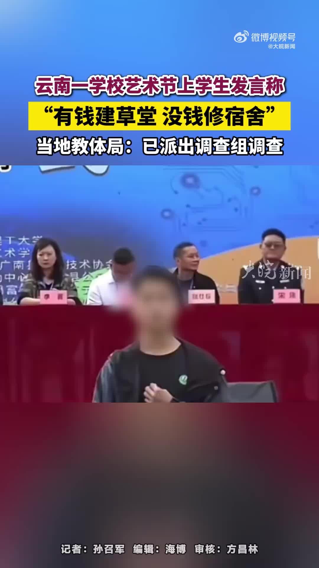 据大皖新闻,11月15日,一段发生在云南文山壮族苗族自治州富宁县某高中艺术节开幕式上的视频引发众多网民关注,视频里有学生在学校文体艺术节上反映学校“有钱修草堂没钱修宿舍”随后,该学生被校方工作人员制止并带离操场。