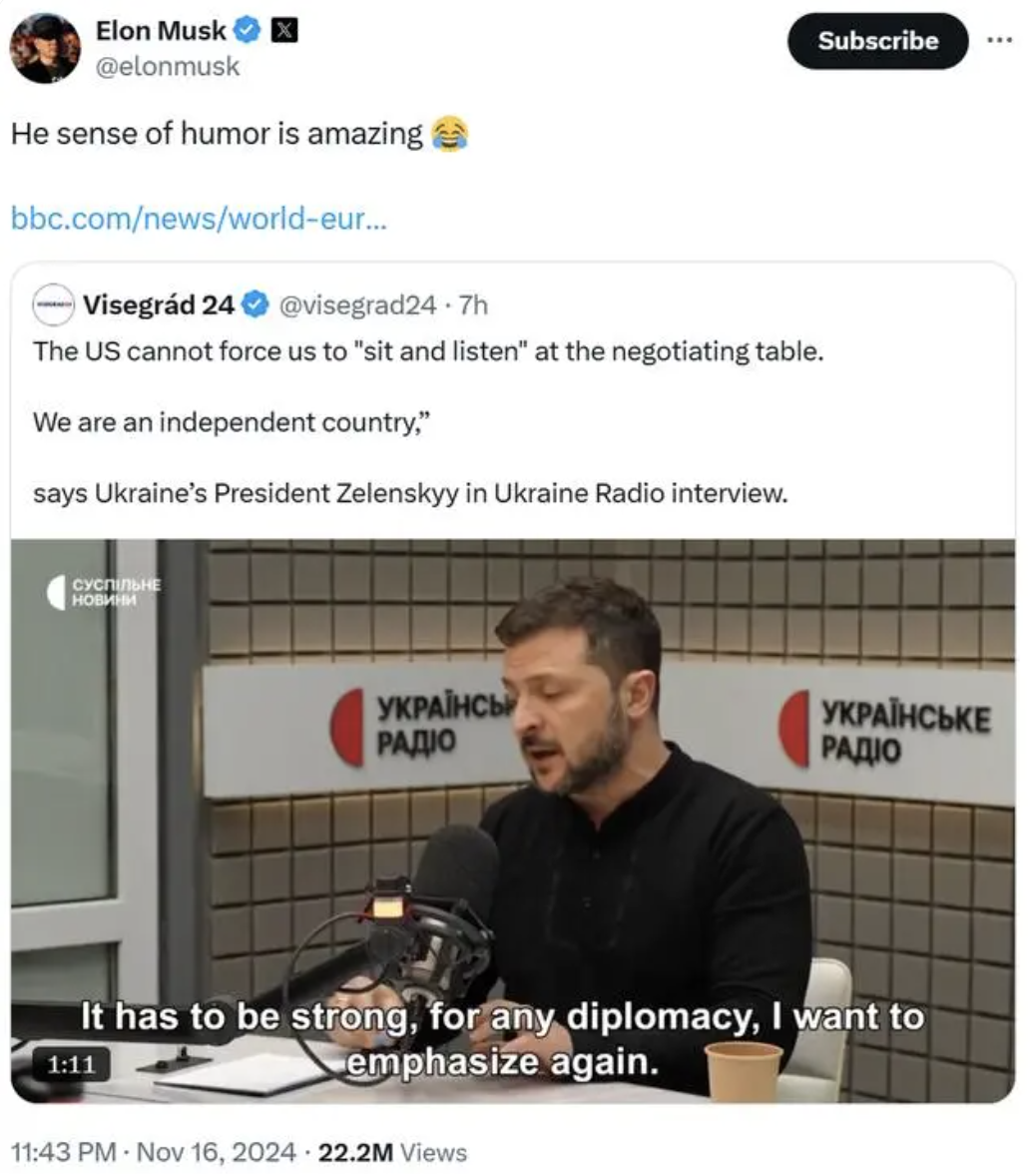 据观察者网,当地时间11月16日,美国当选总统特朗普的亲密顾问、亿万富豪马斯克在X平台上转发了一则关于“泽连斯基称乌克兰是独立国家,美国不能强迫其坐在谈判桌上倾听”的消息,并讽刺道,“他的幽默感令人惊叹,”句末还配上一个“笑哭”的表情。