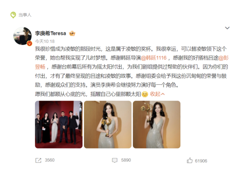11月17日,李庚希发文道:“我很珍惜成为凌敏的那段时光,这是属于凌敏的奖杯。我很幸运,可以替凌敏领下这个荣誉,她也帮我实现了儿时梦想。”
