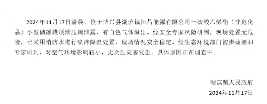 据魅力湖滨消息,2024年11月17日清晨,位于博兴县湖滨镇恒昌能源有限公司一碳酸乙烯酯(非危化品)小型储罐罐顶泄压阀泄漏,有白色气体溢出。经安全专家风险研判,现场处置无危险,已采用消防水进行喷淋降温处置,现场情况安全稳定。经生态环境部门初步检测和专家研判,对空气环境影响较小,无次生灾害发生。具体原因正在调查中。