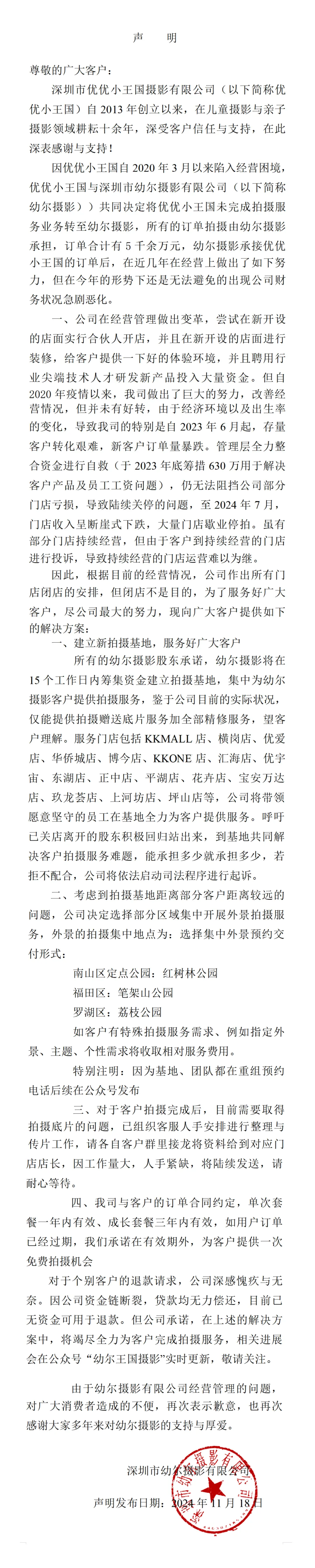 深圳幼尔摄影关闭所有门店,承诺半月内筹资建拍摄基地集中提供服务。
