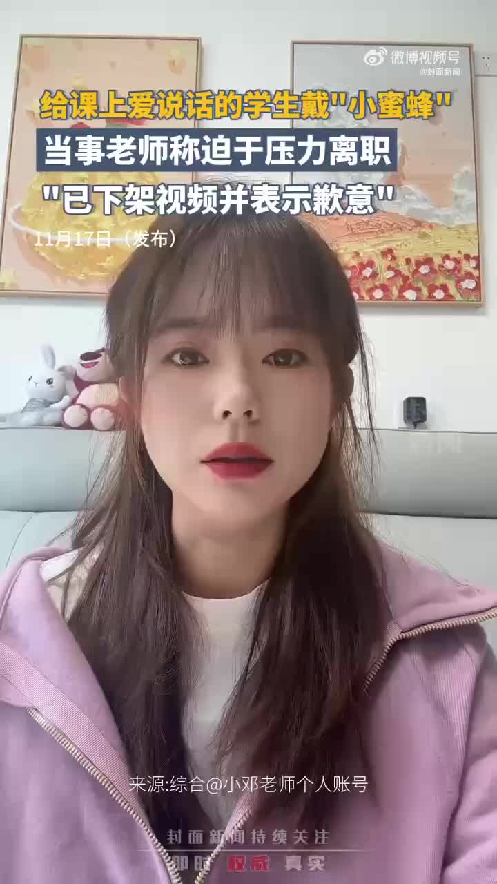 给学生戴小蜜蜂的女老师道歉:迫于压力已离职。