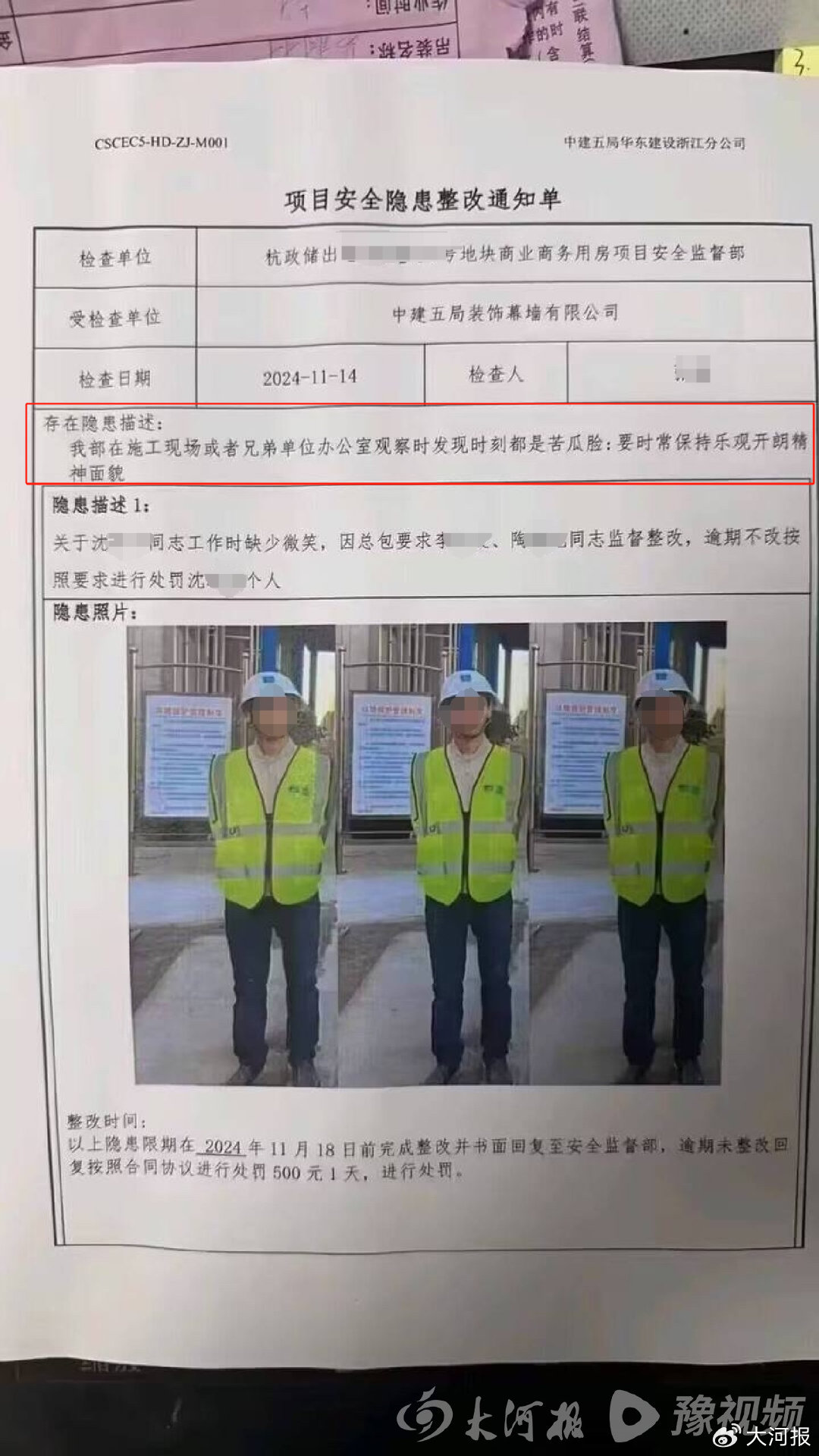 据大河报,近日,网上流传一份中建五局华东建设浙江分公司《项目安全隐患整改通知单》引发网友热议。
