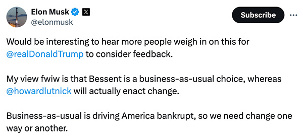 马斯克公开插手新财长提名,特朗普团队内部不满:“他成了联席总统”。