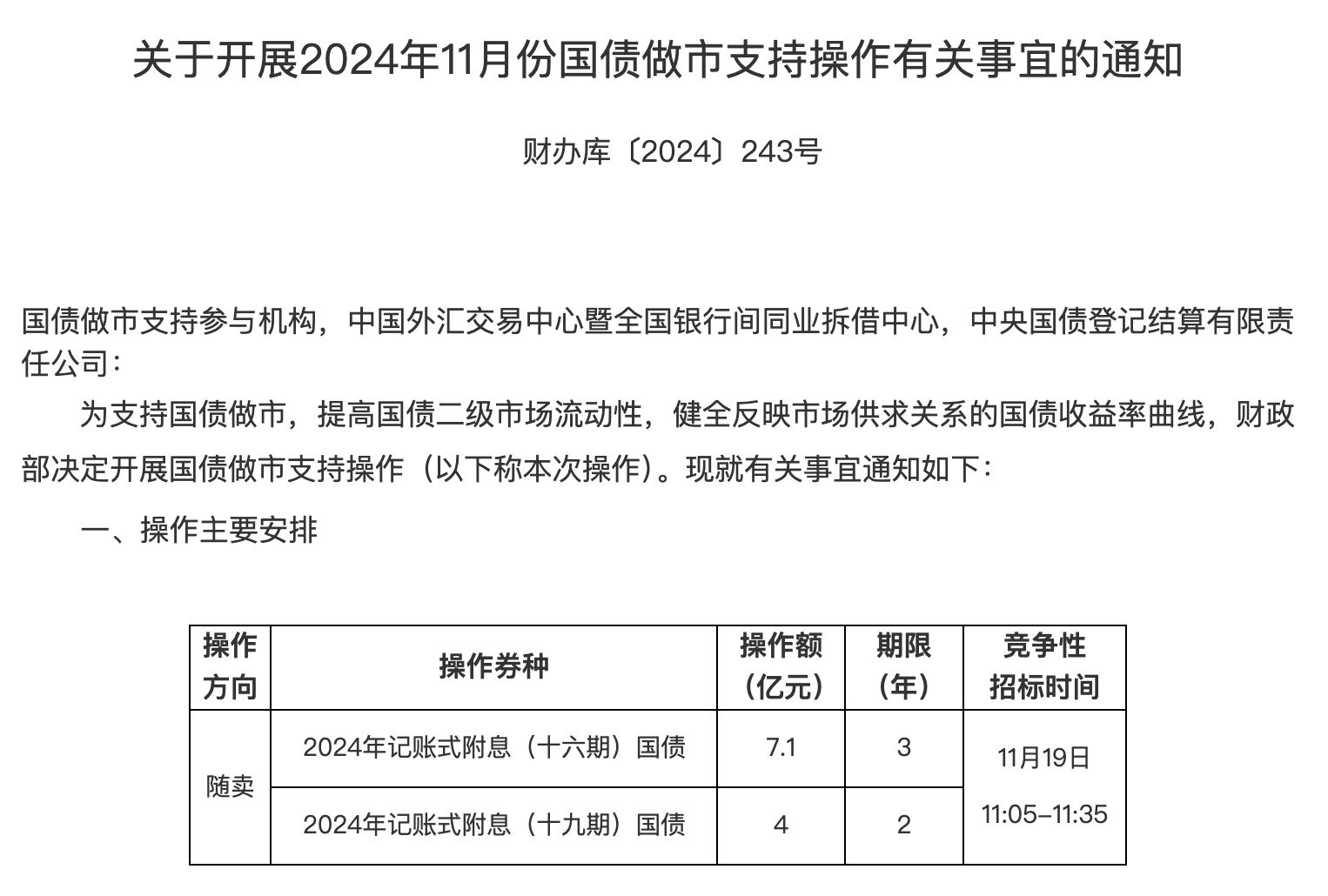 11月18日消息,为支持国债做市,提高国债二级市场流动性,健全反映市场供求关系的国债收益率曲线,财政部决定开展国债做市支持操作。操作方向:随卖。操作券种:2024年记账式附息(十六期)国债7.1亿元。2024年记账式附息(十九期)国债4亿元。