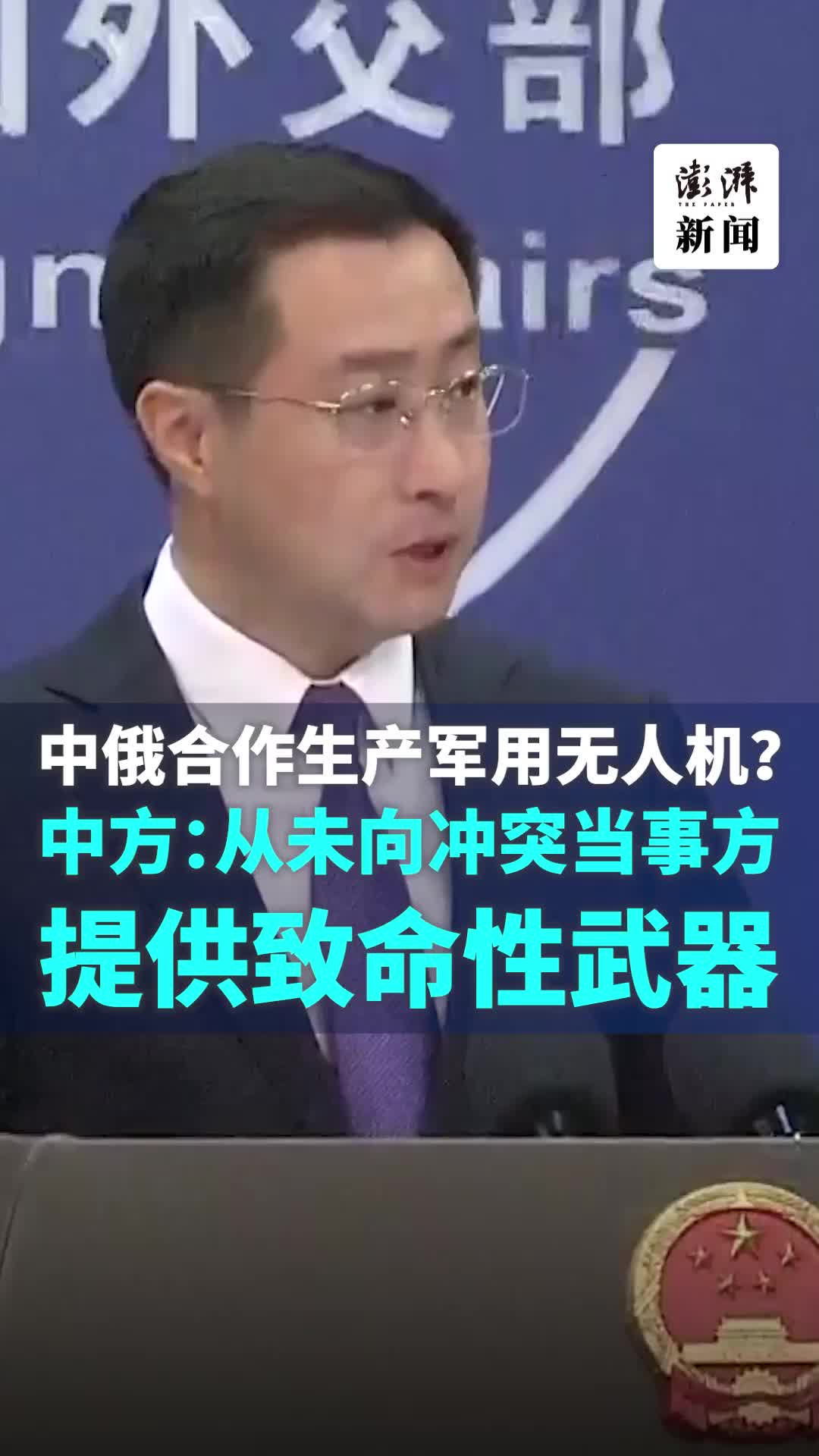 据澎湃,11月18日,外交部发言人林剑回应欧盟情报机构称已获得有关中国和俄罗斯在生产军用无人机方面进行合作的信息。林剑表示,中方从未向冲突的当事方提供致命性武器。(via 澎湃新闻)