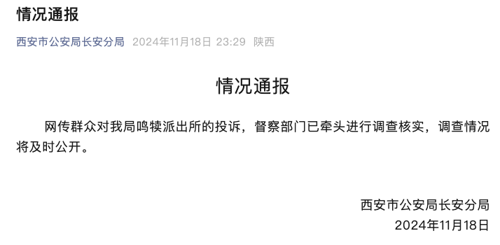 西安警方通报一派出所被投诉:督察部门调查核实。