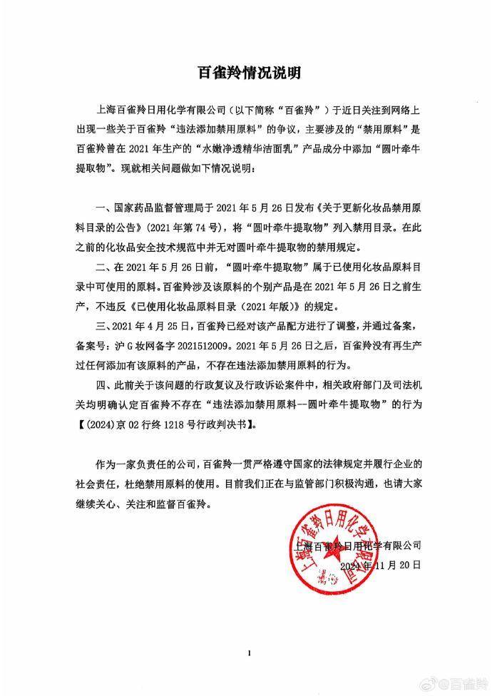 百雀羚回应网传“化妆品涉嫌添加禁用原料”。