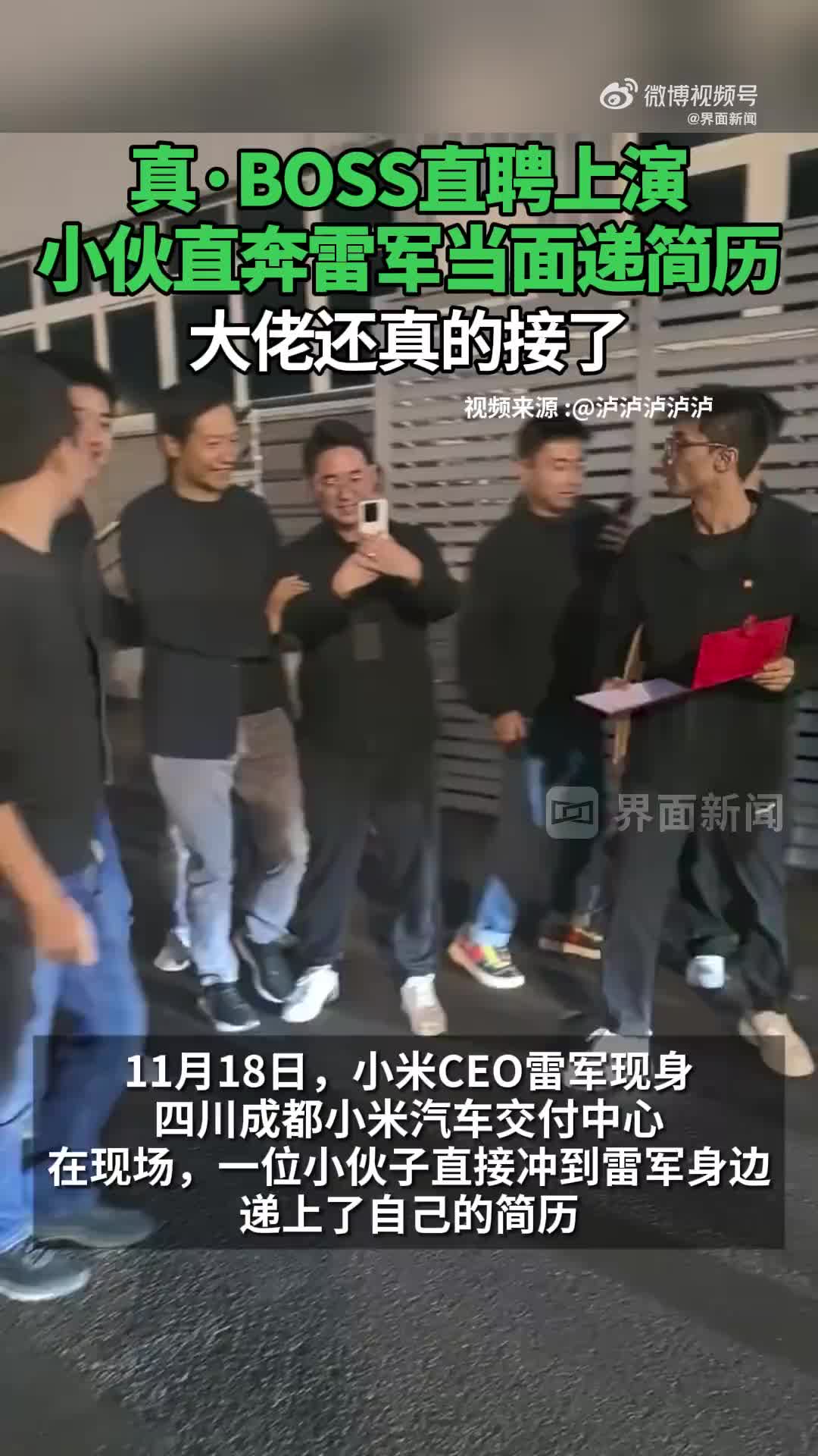 据界面新闻,11月18日,小米CEO雷军现身四川成都小米汽车交付中心。在现场,一位小伙子直接冲到雷军身边,递上了自己的简历。
