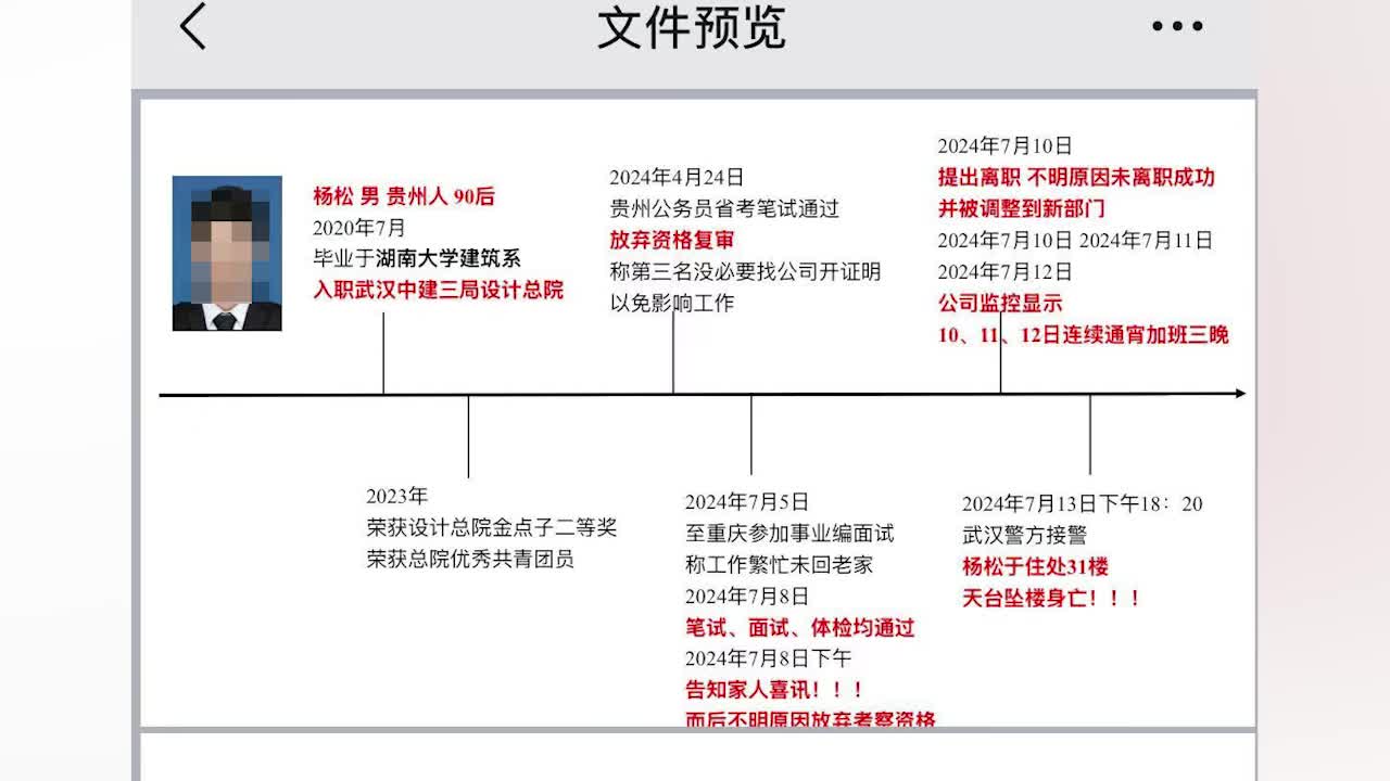 据澎湃新闻,中建三局设计总院31岁建筑设计师杨松坠亡已4个月。家属称,他生前通宵加班,且莫名放弃其他省市入编考察。公司家属对接人以及同事拒绝回应。(via 澎湃新闻)