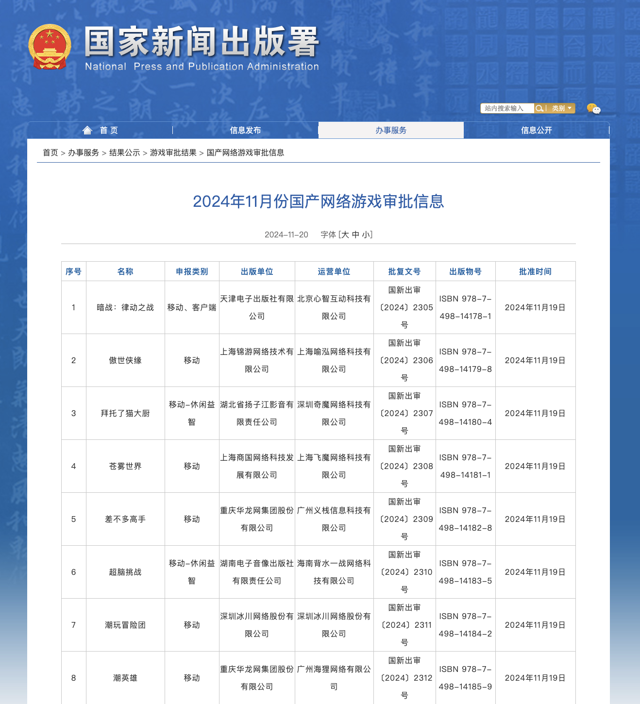 国家新闻出版署公布2024年11月份国产网络游戏审批信息,共112款游戏获批。