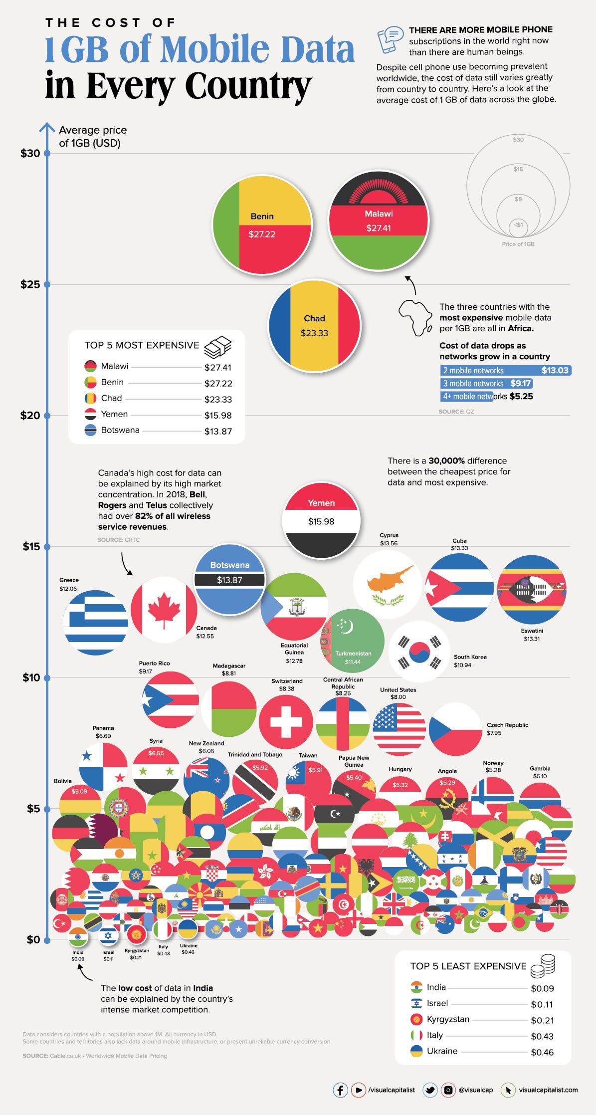 尽管网络在全球范围内越来越流行,但获得访问的成本因国家、地区而异,尤其是在移动数据价格方面。图表数据来展示155个不同国家和地区的1 GB移动数据的平均成本。