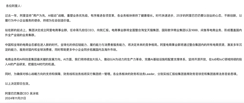 11月21日,阿里巴巴集团CEO吴泳铭发布全员邮件,宣布成立阿里电商事业群,任命蒋凡负责,向吴泳铭汇报。新的电商事业群将全面整合淘宝天猫集团、国际数字商业集团以及1688、闲鱼等电商业务,形成覆盖国内外全产业链的业务集群。