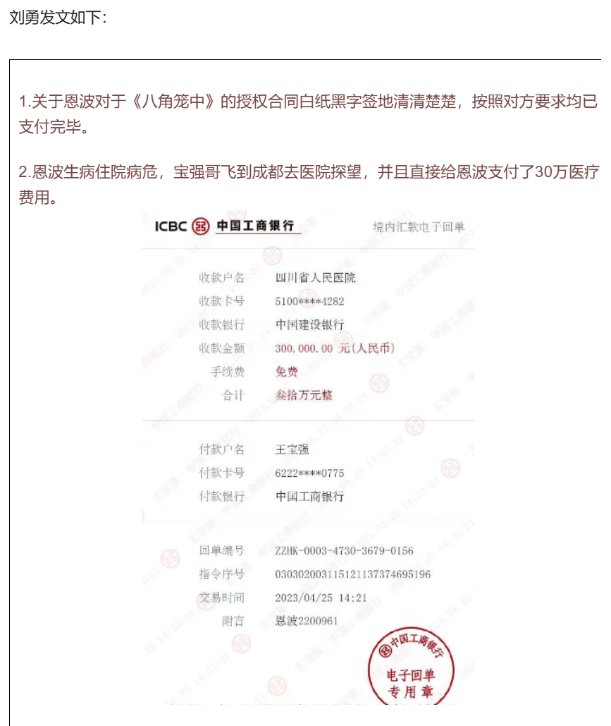 刘勇发文获得知名律师张起淮留言力挺,张起淮在朋友圈发文,称“宝强,为人正直,言而有信,‘达摩克里斯之剑’终将刺破虚妄,斩妖除魔”。