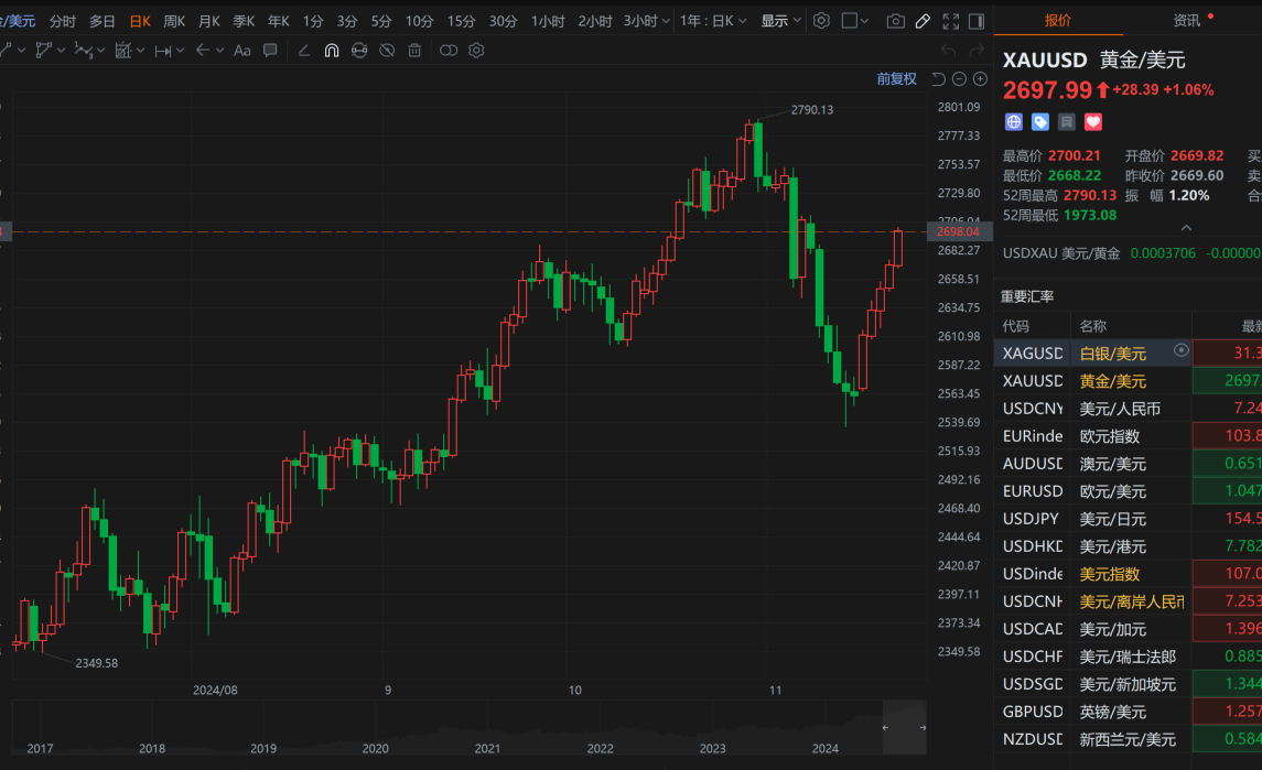 金价连续5日上涨,触及2700美元/盎司。