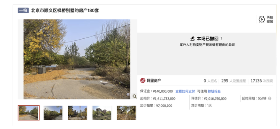 北京顺义180套枫桥别墅整体拍卖被撤回。