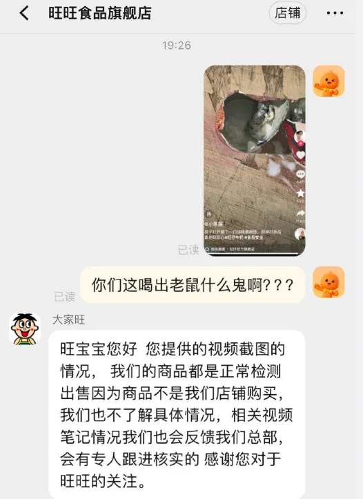旺旺集团高管回应旺仔牛奶疑喝出老鼠。