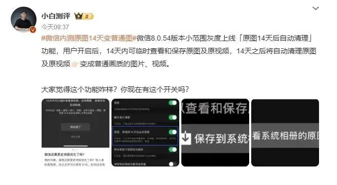 11月22日,多名数码博主爆料称,微信已正式发布了8.0.54版本更新,其中“原图、原视频14天自动清理”功能小范围灰度上线。