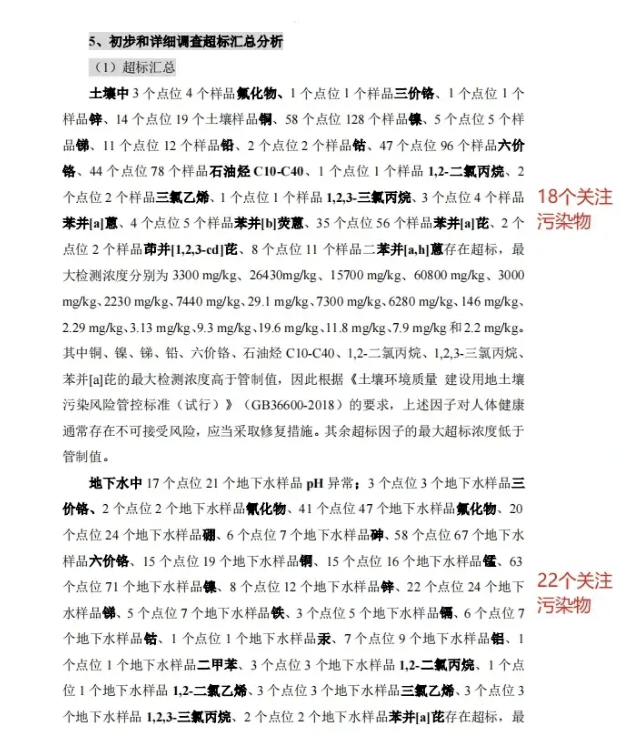 业主们在预看房前后惊讶地发现:同在一整个开发区域内的一块地,土壤中有18种化学物质,地下水中有22种化学物质。