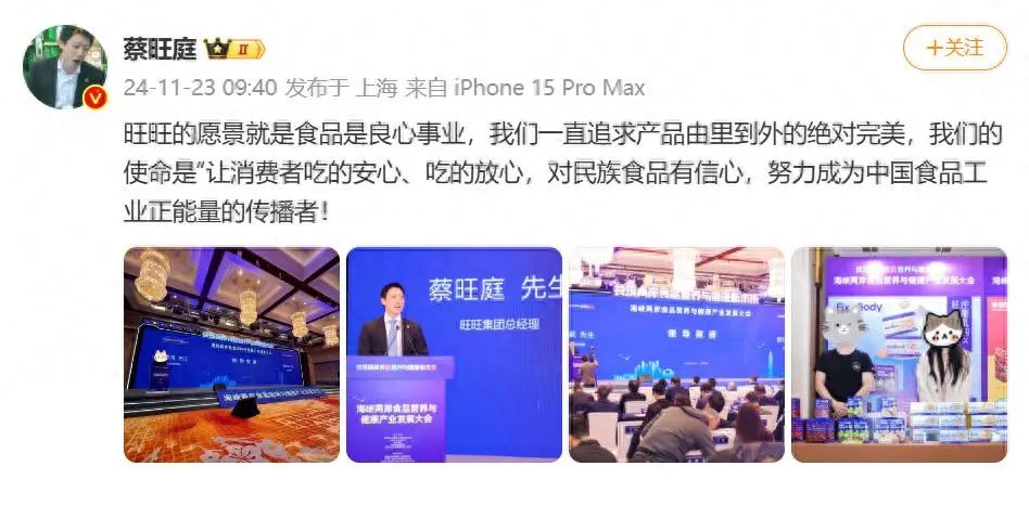 11月23日,旺旺集团总经理蔡旺庭再发文称:“旺旺的愿景就是食品是良心事业,我们一直追求产品由里到外的绝对完美,我们的使命是让消费者吃的安心、吃的放心,对民族食品有信心,努力成为中国食品工业正能量的传播者!”