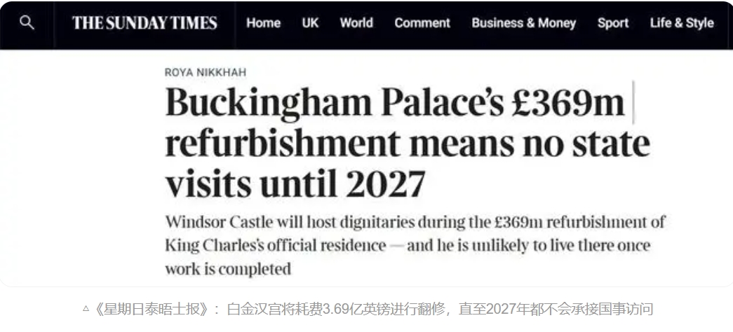 据央视,当地时间11月23日公布的消息,英国王室的府邸、常承接外国高级领导人国事访问活动的白金汉宫将耗费3.69亿英镑进行翻修,由此直至2027年,白金汉宫都不会再承接国事访问的活动。
