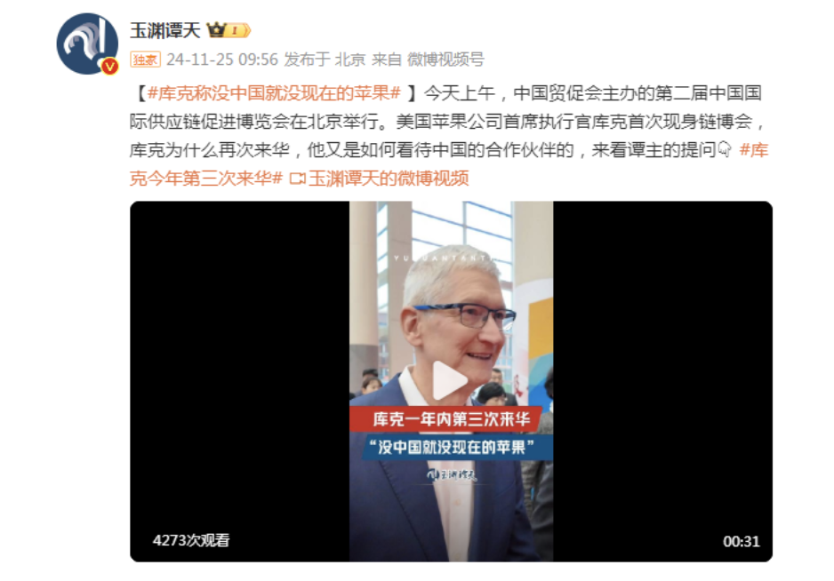 据玉渊谭天,1月25日,中国贸促会主办的第二届中国国际供应链促进博览会在北京举行。美国苹果公司首席执行官库克首次现身链博会,而这也是他在今年内第三次来华。在回答如何评价苹果在中国的合作伙伴时,库克表示,“我非常重视他们,没有中国的合作伙伴们,苹果就无法取得今天的成就”。现场苹果公司的展览牌上写道,“Apple的200家主要供应商中有超过80%在中国生产”。