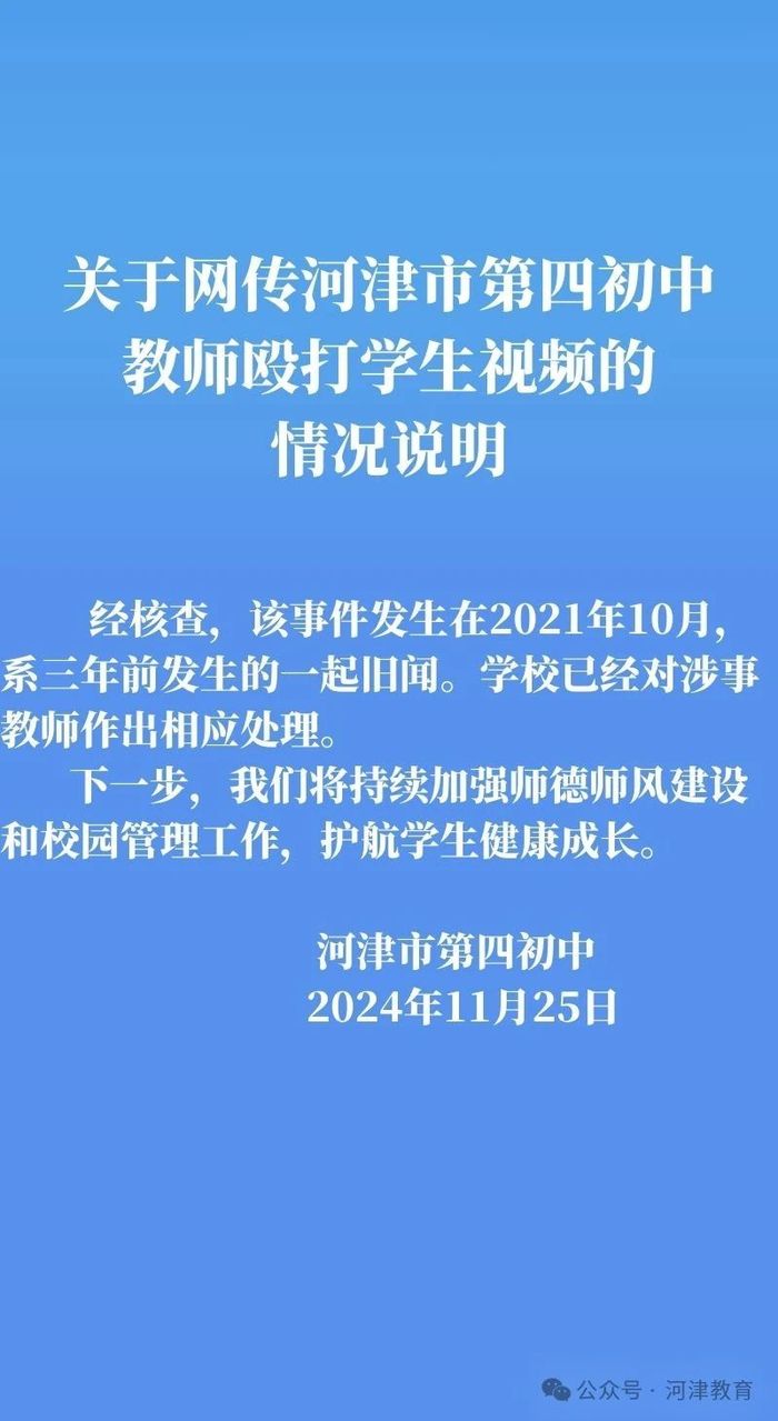 河津市第四初中11月25日发布《关于网传河津市第四初中教师殴打学生视频的情况说明》:经核查,该事件发生在2021年10月,系三年前发生的一起旧闻。学校已经对涉事教师作出相应处理。
