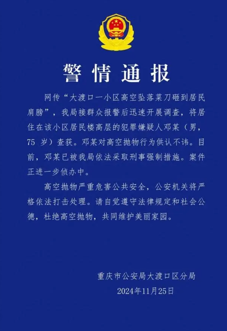 11月25日,重庆市公安局大渡口区分局发布警情通报称:网传“大渡口一小区高空坠落菜刀砸到居民肩膀”,我局接群众报警后迅速开展调查,将居住在该小区居民楼高层的犯罪嫌疑人邓某(男,75岁)查获。邓某对高空抛物行为供认不讳。目前,邓某已被我局依法采取刑事强制措施。案件正进一步侦办中。