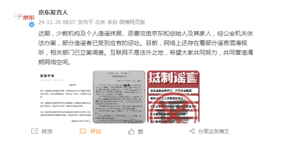 11月26日,京东在微博发布声明:近期,少数机构及个人造谣抹黑、恶意攻击京东和创始人及其家人,经公安机关依法办案,部分造谣者已受到应有的惩处。目前,网络上还存在着部分谣言混淆视听,相关部门已立案调查。互联网不是法外之地,希望大家共同努力,共同营造清朗网络空间。