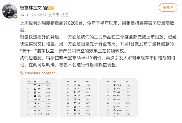 据界面新闻,11月26日,极氪智能科技副总裁林金文在其个人微博回应特斯拉降价。他表示,上周极氪的周度销量超过6200台,今年下半年以来,周销量持续突破历史最高数据。“我们也看到,特斯拉昨天宣布Model Y调价,再次引发大家对年底车市价格战的讨论。在此可以明确,极氪不会进行价格和权益调整。”