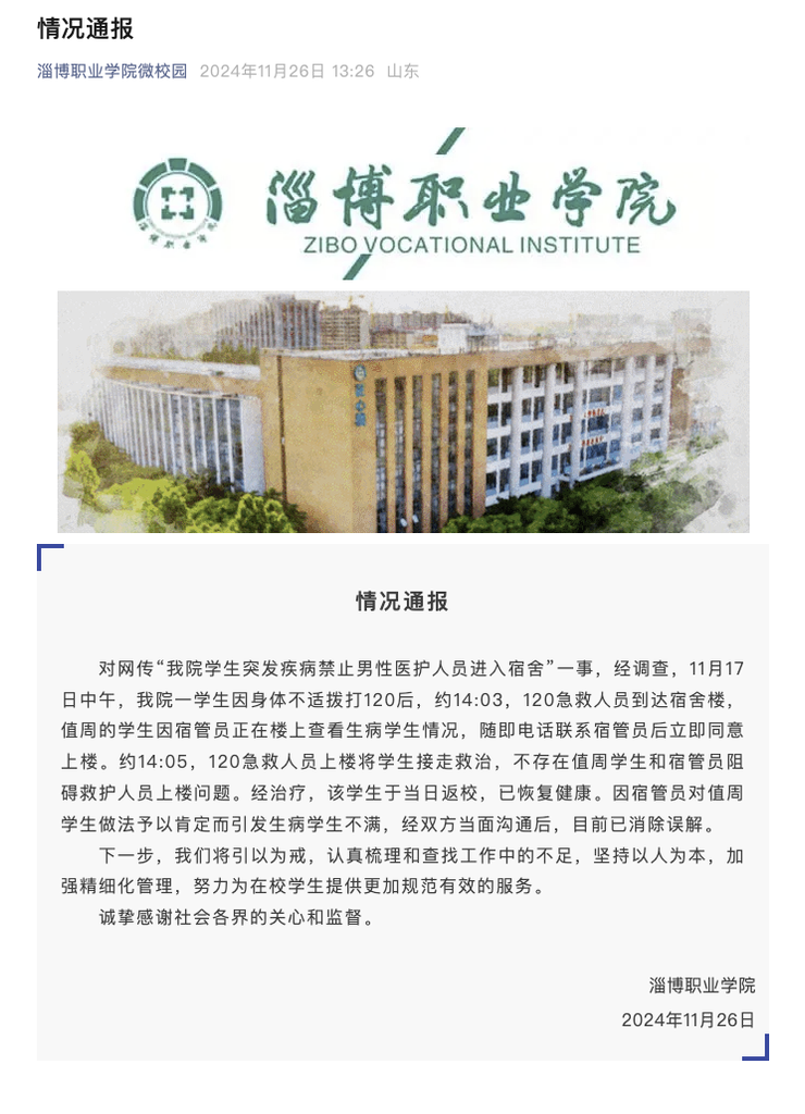 山东淄博职业学院11月26日通报,对网传“我院学生突发疾病禁止男性医护人员进入宿舍”一事,经调查,11月17日中午,该院一学生因身体不适拨打120后,约14:03,120急救人员到达宿舍楼,值周的学生因宿管员正在楼上查看生病学生情况,随即电话联系宿管员后立即同意上楼。约14:05,120急救人员上楼将学生接走救治,不存在值周学生和宿管员阻碍救护人员上楼问题。