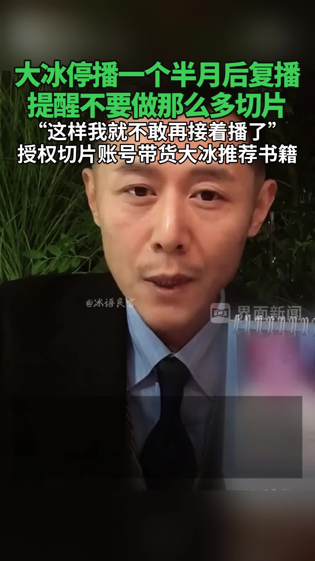 大冰停播一个半月后复播,提醒不要做那么多切片,“这样我就不敢再接着播了”。