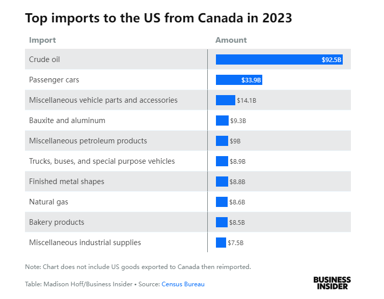 具体而言,2023年,美国从加拿大进口最多的包括价值超过920亿美元的原油,约340亿美元的乘用车和近90亿美元的天然气。