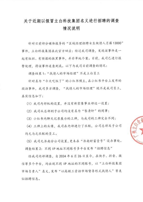 据新京报,立白科技集团官博发布关于近期以假冒立白科技集团名义进行招聘的调查情况说明,内容如下: