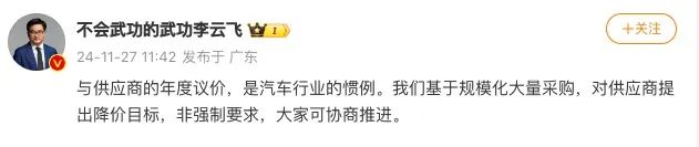 “与供应商的年度议价,是汽车行业的惯例。我们基于规模化大量采购,对供应商提出降价目标,非强制要求,大家可协商推进。”对此,比亚迪集团品牌及公关处总经理李云飞在其个人微博上回应称。