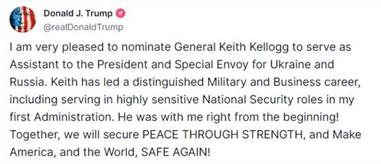 据央视新闻,11月27日,美国当选总统特朗普表示将选择退役美国陆军中将、特朗普第一个总统任期时担任过白宫国家安全委员会幕僚长的基思·凯洛格出任美国俄乌冲突问题特使。