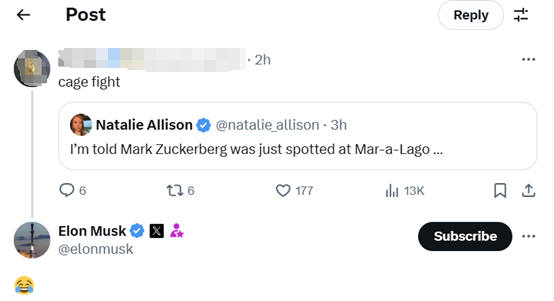 此外,一名网友还转发了艾莉森这则帖子并评论称,“笼斗”。对此,马斯克用一个“笑哭”的表情作出回应。