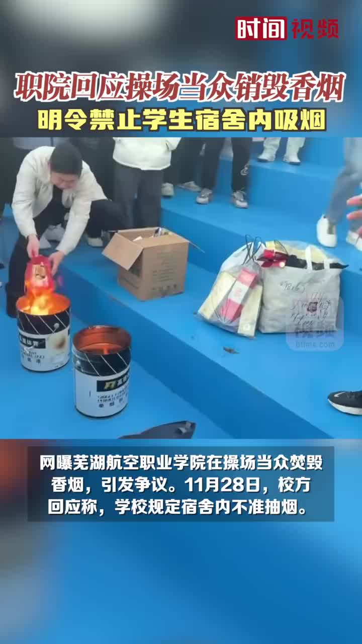 近日,网曝安徽芜湖航空职业学院在操场当众焚毁香烟,引发争议。11月28日,校方回应称,学校规定宿舍内不准抽烟。该校学工处工作人员称,查寝时发现较多学生携带香烟,一方面是容易发生火灾,另外销烟也是为学生健康考虑。 (via 时间视频)