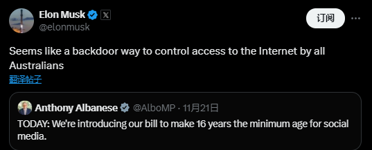 美国知名企业家、“X”的所有者埃隆·马斯克曾多次发文,反对澳大利亚对社交媒体的限制。脸书(Facebook)母公司“元”(Meta)的一位发言人表示,脸书的所有者尊重澳大利亚的法律,但它对这一过程感到“担忧”。阅后即焚(Snapchat)的母公司发言人在一封电子邮件中表示,该公司将遵守澳大利亚的法律法规,但对该立法表示严重关切。