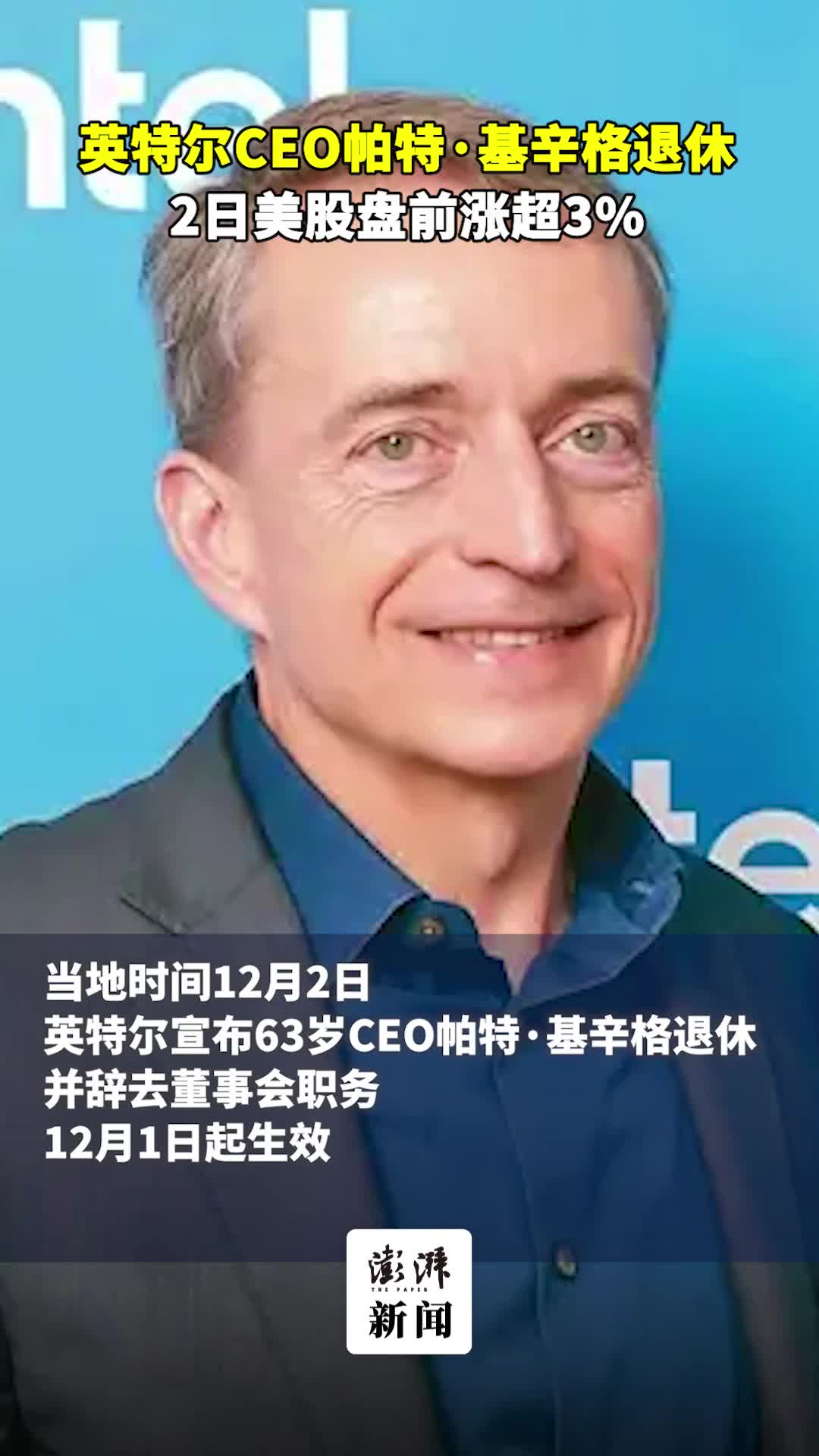 63岁英特尔CEO帕特·基辛格退休,美股盘前涨超3%。