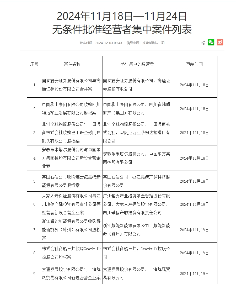 据财联社,国家市场监督管理总局发布11月18日—11月24日无条件批准经营者集中案件列表,其中包括国泰君安证券股份有限公司与海通证券股份有限公司合并案、中国稀土集团有限公司收购四川和地矿业发展有限公司股权案等。