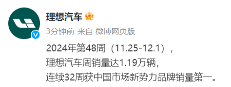 据界面,理想汽车微博12月3日消息,2024年第48周(11月25日-12月1日), 理想汽车周销量达1.19万辆。
