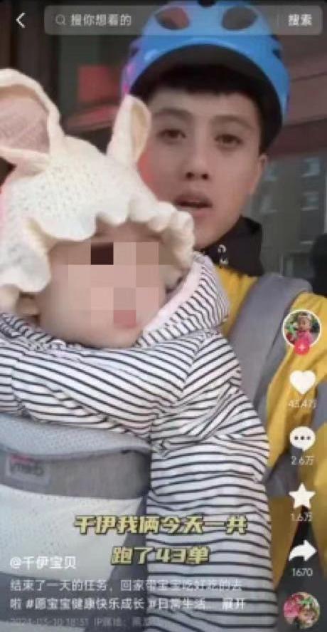 视频中抱着孩子的外卖骑手父亲“小松”正讲述着今天的故事。评论区来自叔叔阿姨的关心和高达43万的点赞使他充满“创作热情”。“小松”已经在各类平台发布了百余条短视频,个人主页中充满了“离开了妈妈”等字样。靠着发布自己和女儿一起送外卖的视频,“小松”已经在各类网络平台积累了40余万粉丝,也在直播带货中取得了收益。