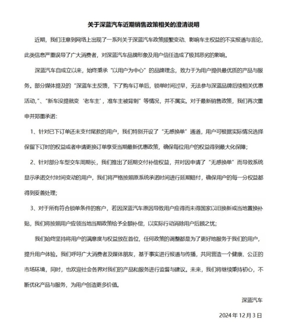 12月3日,深蓝汽车就近期销售政策发布澄清说明,称部分媒体提及的“深蓝车主反馈,下了购车订单后,锁单时间过早,无法参与深蓝品牌后续相关优惠活动,”、“新车没提就变‘老车主’,准车主被背刺”等情况,并不属实。