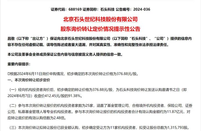 所谓的“套现9亿元”,与昌敬此前的两次减持存在关联。据石头科技公告,今年6月,昌敬通过询价转让其持有的公司股票131.58万股。询价转让定价为376.88元,相关金额达4.96亿元。